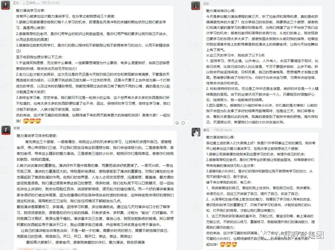 2023年6月底7月初,本公司统一参加了80人以上由爱上进企业联合会组织的四天三晚魅力演说学习。一个人的成功百分之八十五是靠他的人际沟通和演说能力,只有百分之十五跟她的专业技能相关。语言是人与人之间沟通的桥梁,是人类最重要的交通工具。